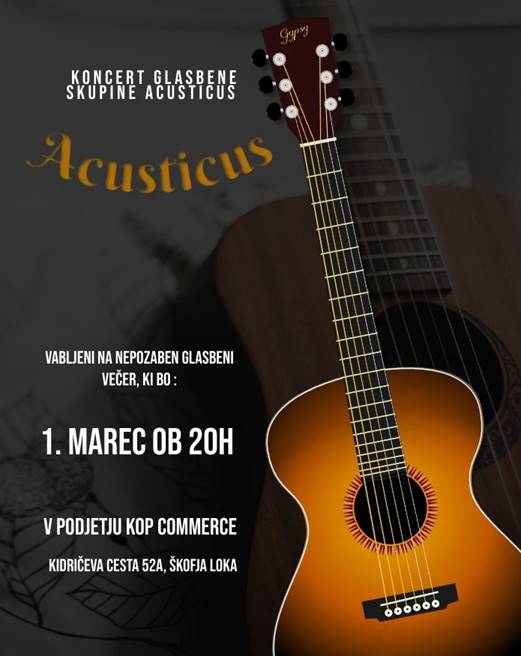 Polepšaj si vstop v marec z nepozabnim glasbenim doživetjem s skupino ACUSTICUS dne 1.3.2024 ob 20h v prostorih Kop Commerca na Kidričevi cesti 52A.